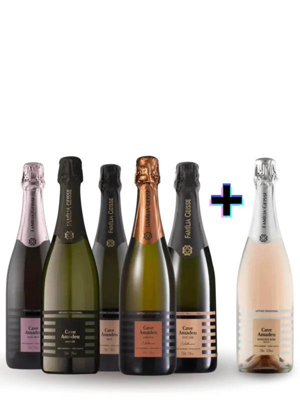 Kit Cave Amadeu (6 garrafas) reúne do clássico ao mais ousado: espumantes Brut, Nature, Rosé, Demi-sec, Laranja Nature e Sur Lie.